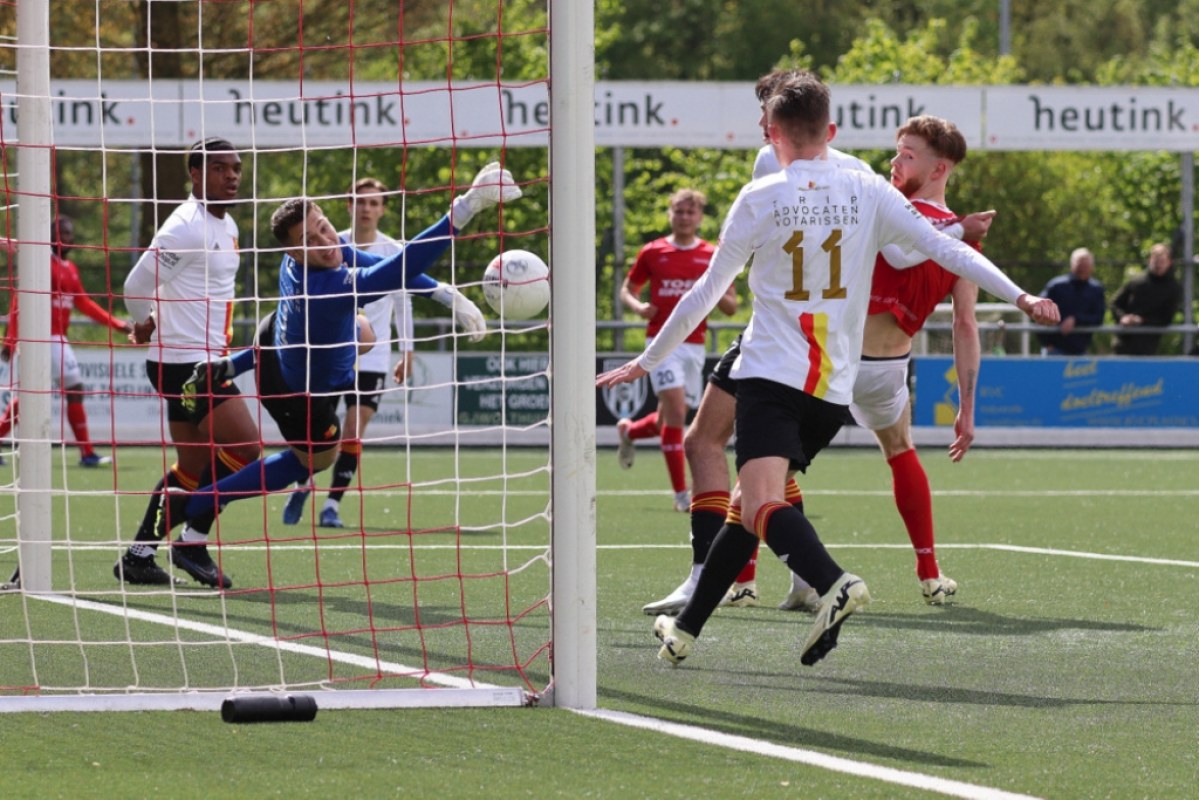 De weinige kansen in de eerste helft hoopten zich in de 32e minuut ineens op. Er werd een inzet van Steff Kaptein voor de lijn weggehaald, Coplan Soumaoro zijn schot eindigde op de vuisten van Stein Barkhuis en ook Jasper Veltkamp zijn poging was er een van net niet.